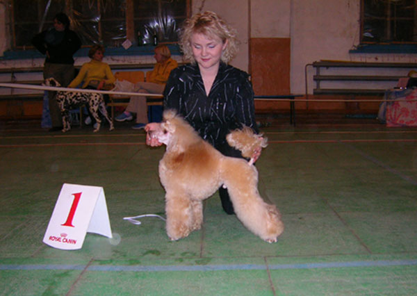 ЮСАС, которые нам уже и не был нужен (так как был бы восьмым), нам не дали, потому что: 1) ногами слишком машет, а движения у пуделя должны быть такие, как будто он едет на велосипеде...т.е. отвратительные у нас движения ; 2) морда под глазами не заполнена (потом искали всей выставкой, не нашли...) и вообще (!) "зачем это вы морду так побрили, разве вы не знаете, что морду пуделю надо брить за две недели до выставки! Так что ЮСАСа оба кобеля оказались совсем не достойны А это мой "позорный" мальчик, Солнечный Лев Глинтвейн Бибилотт _______________________________________