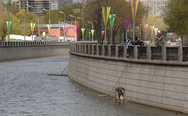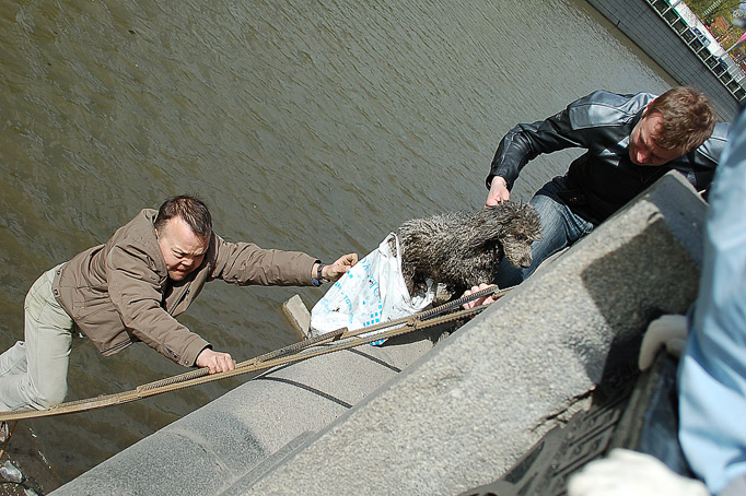 Один из ребят спустился по лестнице, которая была на счастье неподалеку от этого места, и поднял пса наверх.