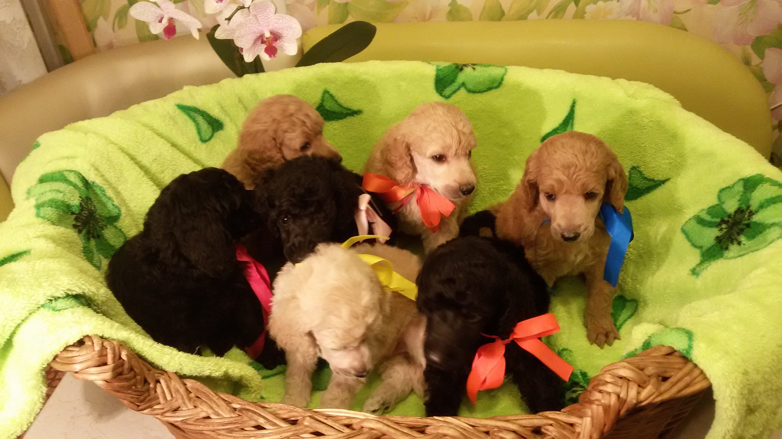 27 АВГУСТА 2015 года в Питомнике Ружовы Свитанак родились 8 щенков большого королевского пуделя (7 мальчиков: 3 черных и 4 абрикосовых; 1 черная девочка).