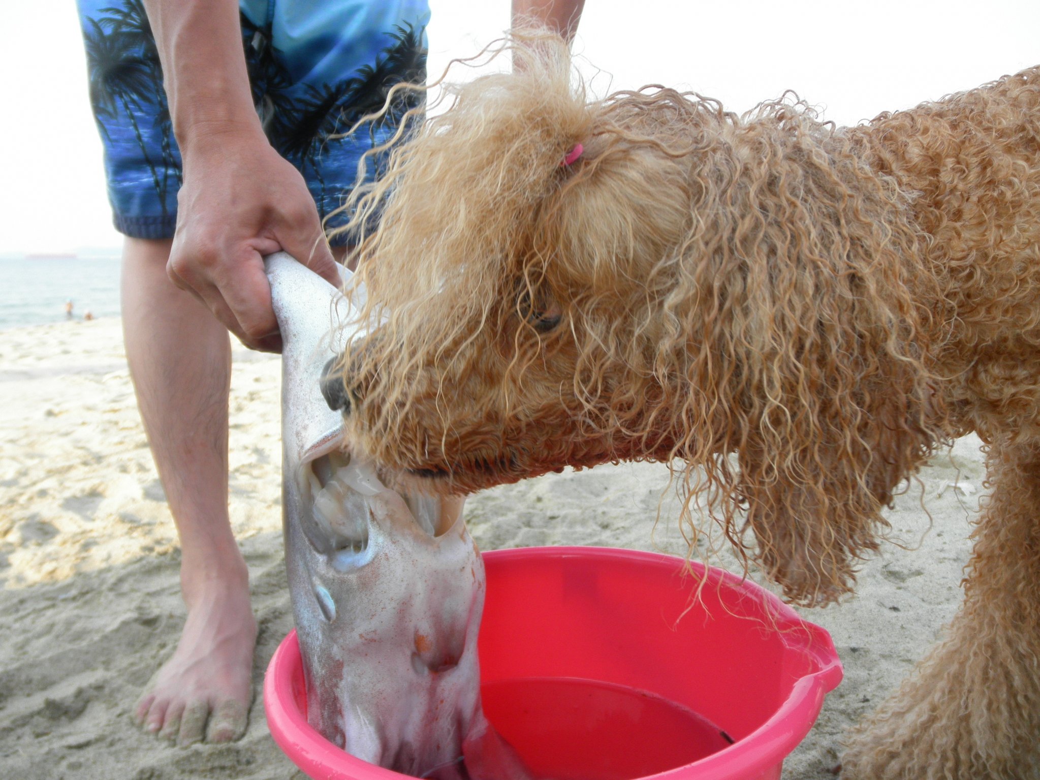 Соседи по пляжу поймали в воде большую каракатицу и маленького осьминога. Каракатица Стасю очень привлекла и Стася пыталась откусить от неё кусочек. Ну или хотя бы отковырять что-нить лапой.