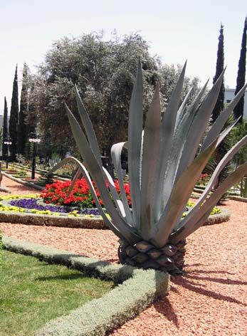 Вот эта агава огромная такая, растет прямо на повороте с дорожки на дорожку. Её приходится обходить. Она нарушает вроде-бы стройность геометрического замысла... Так выросла или бахаиты ее посадили? Не так ли неожиданные события нарушают наши планы? Иногда очень точно рассчитанные. Почти так же точно как дорожки садов Бахаи. _______________________________________