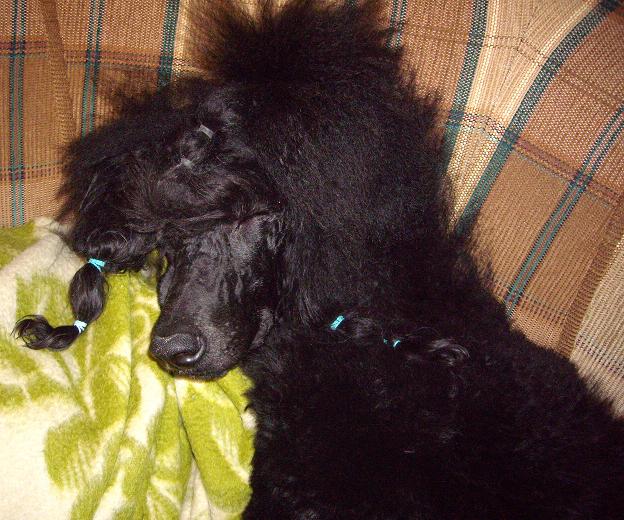 Где ж еще пуделечек должен лежать! У нас в доме, как считают некоторые хвостатые, постель, подушки, пуховое одеяло только для пуделя! Искренне удивляются , когда я их водворяю на свои места! |