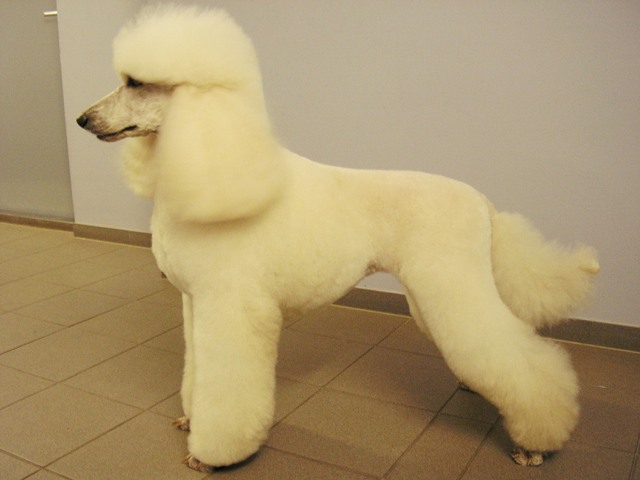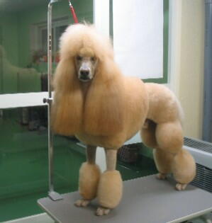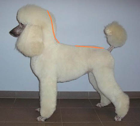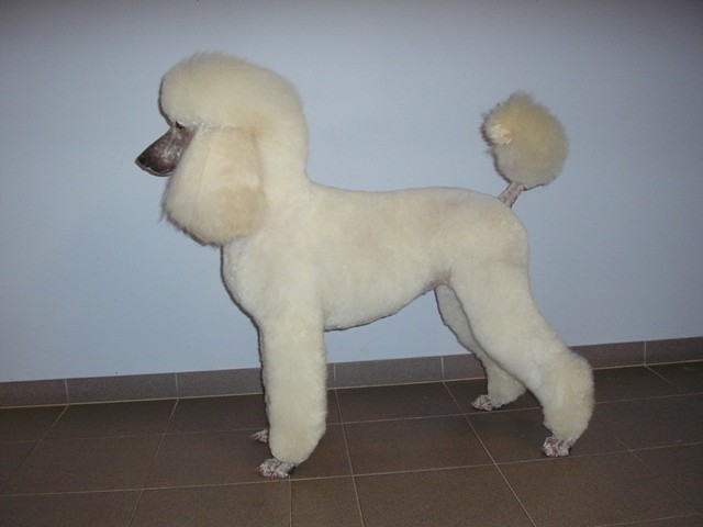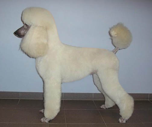 ALLOWED SHOW CLIPS « Lion clip » : The poodle, whether curly or corded, shall be clipped on the hindquarters up to the ribs. Also clipped : the muzzle, above and underneath from the lower eyelids; the cheeks, the fore-and hindlegs, apart from cuffs or bracelets and optional motifs on the hinquarters, the tail, except a round or oblong terminal pompom. The moustache is required for all subjects. Keeping hair on the front legs, called « trousers », is admitted. « Modern clip » : Keeping hair on the four legs is only permitted providing the following norm standards are respected : 1. - Shall be clipped : • a) The lower part of the front legs, from the nails to the tip of the dewclaw, the lower part of the hindlegs up to an equivalent The suppression of the pompom on the tail (but this will slightly diminish the rating for « texture of coat »). 2. - Shortened coat : On the body, to show on the back line a moiré (shot silk) effect more or less long of at least 1 centimeter. The length of the coat shall be progressively increased around the ribs and above the legs. 3. - Regularized hair : a) On the head which stays with a casque (topknot) of reasonable height as well as on the neck, descending behind the neck to the withers, and in front, without discontinuity down to the shaven part of the foot following a slightly slanting line from the upper part of the forechest downward. On the upper part of the ears and up to a third of their maximum length, the hair may be cut with scissors or shaved in the direction of the hair. The lower part is left covered with hair of a length increasing progressively from top to bottom, to end up in fringes which can be adjusted. b) On the legs, « trousers » marking a distinct transition with the shaven part of the feet. The length of the hair increases progressively upwards to show on the shoulder as on the thigh a length of 4 to 7 cm measured on straightened hair, in proportion with the size of the dog but avoiding any « bouffant » (buffy). The « trousers » on the back legs must allow the typical angulation of the poodle to be seen. All other fancy clips which do not comply with these norm standards are eliminatory. Whatever the standard outline obtained through the grooming, it must never influence the classification at the shows, all dogs of the same class shall be judged and placed together. « English clip » : Add to the « lion » clip motifs on the hindquarters, i.e. bracelets and cuffs. On the head : a topknot. For this clip, the moustache is optional. Absence of demarcation on the hair of the hindquarters is tolerated. The topknot is optional. height. Machine clipping, limited to the toes only, is permitted. b) The head and the tail as the preceeding rules describe. Shall be exceptionnally permitted in this clipping : • The presence, below the lower jaw, of hair cut short not exceeding one centimeter thickness; its lower line will be cut parallel to the lower jaw. The beard called « goat’s beard » is not tolerated. |