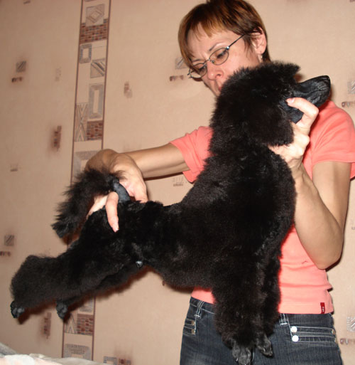 Волшебница - карлик, не очень крупный, на фото ей 3 месяца и ростом она в три месяца была 21 см. Так что маму, наверно, перерастем (она у нас 29,5 см), а до папы не дорастем (он 31 см) И папа и мама моего разведения. Папа коричневый ЖЕЛАННЫЙ ПОДАРОК НЕБЕС (сын Януша Шоколадного Боя), а мама черная ЛИЗАВЕТА ЧЕРНАЯ ЖЕМЧУЖИНА (дочка TOYWAY CHAIN KING). Этот щенок дубль помет, девочка из предыдущего помета обалденной красоты уехала в Хабаровск Вот ее фото _______________________________________