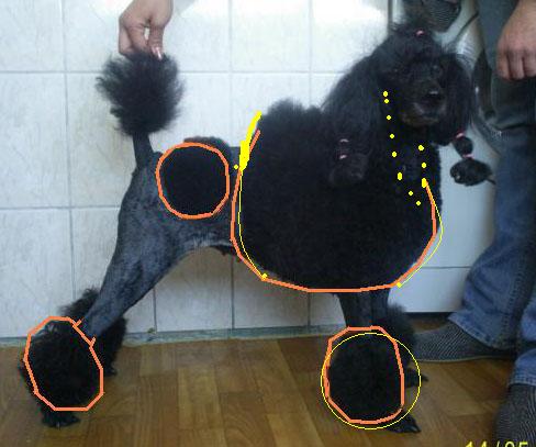 Передний помпон круглым не нужно, а придайте ему форму так. как это очень хорошо описано у Даля про рулон туалетной бумаги. Идеально круглым его делать не нужно, пусть будет немного циллиндром, просто нога должна быть не центром циллиндра, а, как бы чуть смещенно относительно центра чуть назад и во внутрь. Т.е., сам помпон должен быть немного смещен вперед. Самую малость, не экстремально. Чтобы лапу прикрыть, но не полностью. Из под лапы должны выглядывать пальчики, как спереди, так и при осмотре сбоку. И низ помпона обязательно должне быть не на уровне пола (в профиль) а немного выше. Так выглядит аккуратнее. А по заднему краю курточки вот что - ее линия должна быть по крайней точке, нарисованной Викой, но просто немного вертикальнее. А уже от поясницы овормляее ее в соответсвии с длинной гривы на холке и на шее. Но в любом случае оформляеться не округло, а тоже треуголником, как и спереди. Иначе собака будет выглядеть горбатой. Вика правильно линию указала, просто ее нужно самую малость более вертикально поставить. Ой. что-то я путано изъясняюсь..... |
