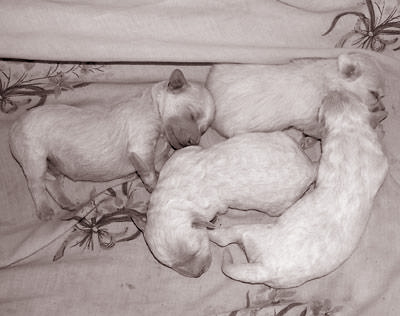 Вот пример того как выглядят суточные щеники белого окраса на фото - кажется что есть маска. На самом деле это розовые мордочки почти не покрытые шерстью. (На фото бишон фриз)
