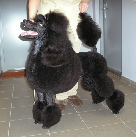 Вообще вся стрижка соответствует анатомии пуделя, мы лишь добавляем чуточку экстрима - немного длинее шея, немного более выражены углы конечностей... Шерсть на спине - горб - убирается в соответствии с длиной шерсти на затылке. Тот же принцип: ведь у пуделя анатомически нет горба, значит, и стрижкой мы его там не делаем. Про ноги - угол колена соответствует анатомическому колену, скакалка - скакалке. Начало верха штанов передних ног соответствует началу самих передних ног (углу предплечья-плеча). Пожалуйста, спрашивайте подробнее что-то: трудно описать за один раз всю стрижку пуделя. |