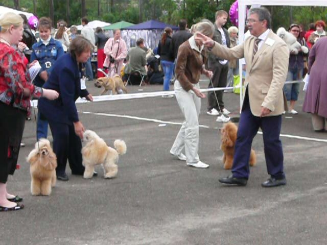 Потемнее - тойка, посветлее - карлик. Обе девочки, разница в росте 1-1,5 см в холке. Поздравляю всех с удачными выходными. Пудели молодцы. Несмотря ни на какие погодные условия. В первый день в Минске прохладно и сильный ветер. Во второй день - сначала тепло, потом можно сказать жарко - а к бестам - проливной дождь. Той пудели сравнивались под крупными каплями дождя и выгнанные со своего ринга, т.к. на месте пуделиного ринга был БЕСТ. Правда погода сжалилась, и к 9 группе уже светило солнышко _______________________________________