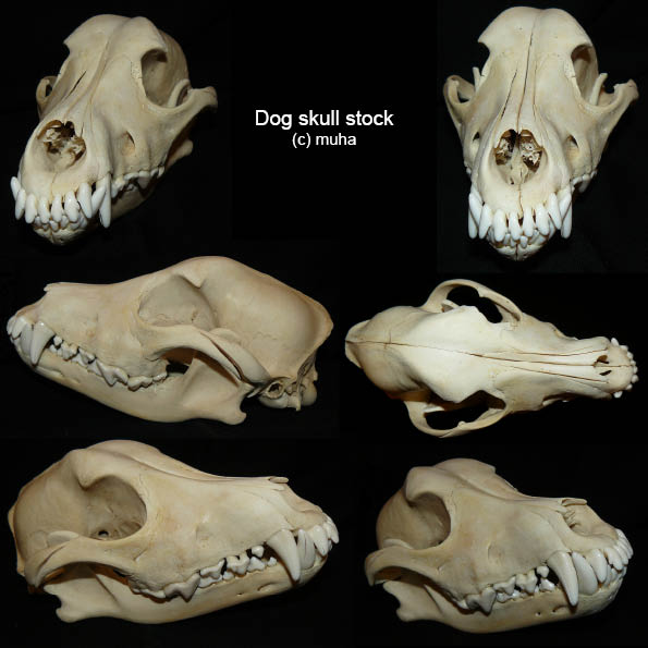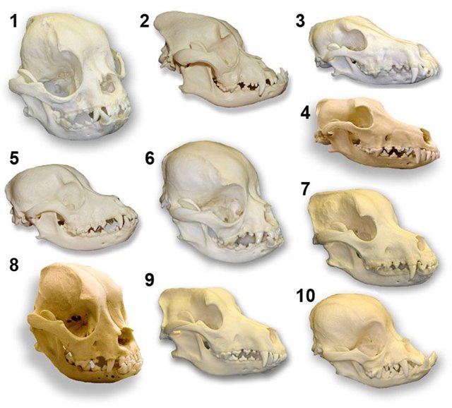 Вот фото настоящих собачьих черепов. Как хорошо видно, бывают разные кости верхней части черепа, в том числе и плоские, всё зависит от породы. |