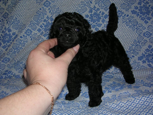 Я повязала свою абсолютно черную девочки с черным кобельком,у кот. мама и все "нижние" родственники-белые.Родились черные девочка и мальчик(как и должно быть).Мальчишка мне очень,очень нравится:оставила себе.Он чем старше,тем чернее становится. В "нежном" возрасте был чуть буроват.Чем больше стрижешь,тем чернее растет новая шерсть.На фото ему почти 4 мес. |