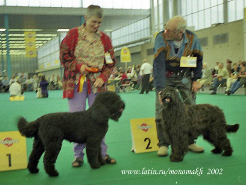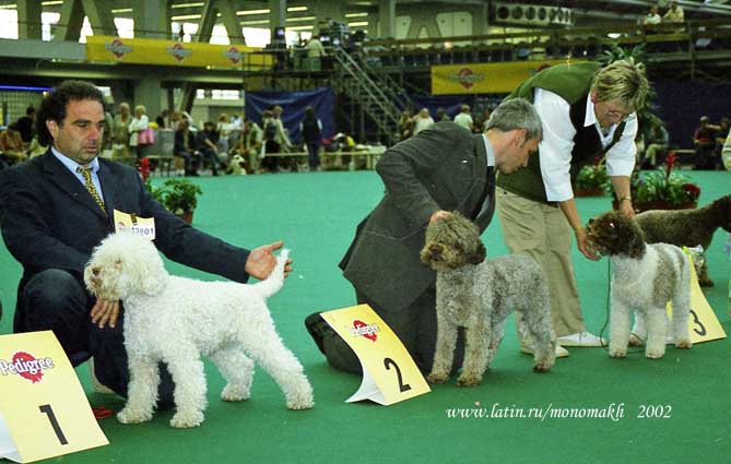 Испанская водная собака. Держала хвост горизонтальной саблей. Но хендлер решил её погладить во время описания и она подняла вот так хвост. В расстановку ушла 4-й.