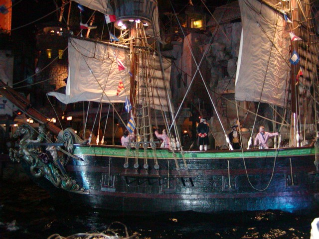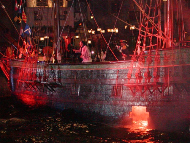 Это около отеля Treasure Island целый спектакль показывают. Вода настоящая и корабль плавает и в конце даже под воду уходит!