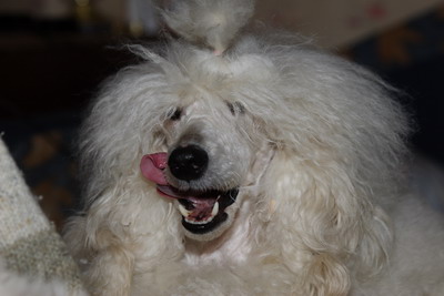 На фото видно, что одна собака не белая. Стандарт был совершенно равномерно кремовый, цвет шерсти ровно прокрашен на всю длинну. Интересно так, первый раз я видела кремовую собаку. Беоый стандарт в английском седле выставлялся. Ничего не получил. На мой взгляд, он сильно заквадрачен, я бы сказала, не квадрат, а прямоугольник, поставленный на короткое ребро. И это несмотря на то, что ему кучу шерсти оставили на груди и попе.