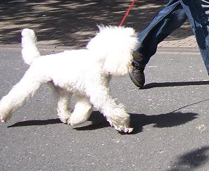 Нет, хэкни там нет. Просто он еще не до конца лапу вперед вынес. Но у него действительно дисбаланс в движении - передние ноги он задирает высоко, с большой амплитудой, и при этом, как правило, падает на перед в той или иной степени. На фото это заметно несильно - манера его движения зависит от настроения. При хорошем настроении недостатки видны минимально. И рыжий и черный пудели - оба неизвестного происхождения. Про черного не знаю, а рыжий куплен на Птичьем рынке. Да, голову снимаемых собак буду пробовать отворачивать. :) Просто не со всеми это удается - собаки же хотят знать, что я делаю, вот и подглядывают за мной. :) Я подумала, что еще шерсть на ушах надо будет резинкой завязывать, чтоб совсем шею не заслоняли. А рыжий как раз во время съемки решил, что самое время сожрать грумера-фотографа. Что стрижку он еще позволяет делать, а вот на фото разрешения не давал. Урод.Цитата: