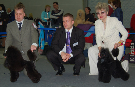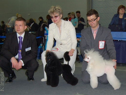 супер результаты! Поздравляю ВСЕХ! Поздравляю Олю Архипову с победами Калины и Карнавала, братика Пружинки- Принца Робина с победой в классе чемпионов и свою Раду с победой в открытом классе и САСом второго дня!!! Я только на выставке заметила, у Радки выдран клок и дырка не глубокая на ноге которую я естственно когда чесала (пока не заметила) задела. Подозреваю это был "подарок" от Пружинки за то, что уехали на выставку без нее. До последнего сомневалась идти ли в ринг, но раз всеравно уехать по некоторым причинам не могли, решили всетаки выйти, темболее Радик вроде разбегалась. Безумно рада за свою девочку, умничка! По рассказам очевидцев в ринге маленько похромала на повороте! А вчера Радочка стала 3 в классе Чемпионов! А вообще в этом году у пуделей конуренция была оочень сильной. _______________________________________