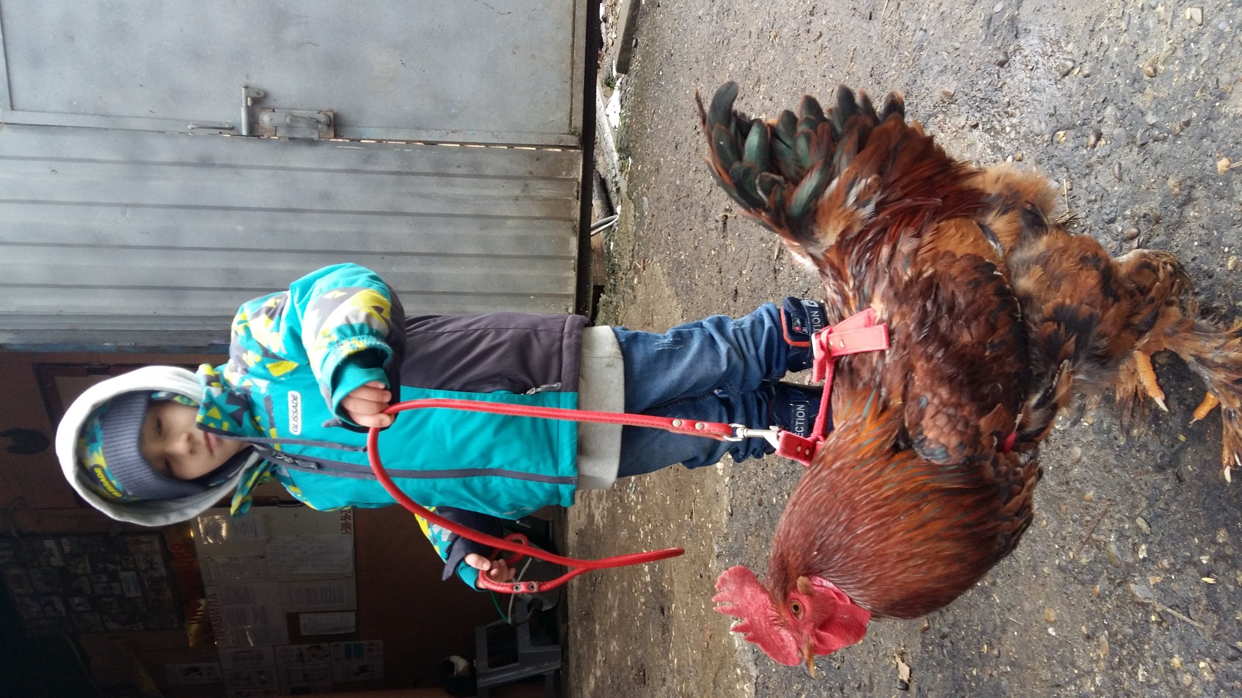 Мой внук гуляет с моим молодым красным петухом породы брама.