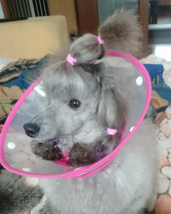 Для меня отращивания шерсти на голове пуделя тоже больной вопрос, косы нам не подходят, т к уже на следующий день превратятся в войлок, мыть собаку каждые два дня я морально не готова. Сейчас шерсть становится лучше, дольше держит вид и не так спутывается как было до полутора лет. Мою, феню ее раз в неделю. Переплетаю резинки каждый день без расчесывания. Т к все равно короткая шерсть выбивается или распадается, начинает лезть в глаза и рот. Грешна, иногда расчесываю, если колтун, с экспресс кондиционером, хотя надо мыть собаку, а не чесать конечно. Папильотки нравится использовать на ушах, чтобы грязь на улице не собирать, уши в миску не падают, очень практично и чисто. На голове не поняла пока нравится или нет, объема шерсти не хватает что ли. Вернулась к резинкам пока, только мягким. Т к латексные нам один раз на ухе просто отрезали часть шерсти, не знаю как так получилось, но выглядело, как-будто ножницами срезали. Хорошо что это было с невыставочной стороны. От латексных резинок рвется шерсть, если собака почешет, то скорее всего 100% оборвет шерсть. Любуюсь собаками, который в повседневной жизни ходят в латексных резинках - красиво, но не для нас. Еще моя собака с которой занимаемся выставочной карьерой почесун-сам себе стилист. При мне, он не смеет трогать голову и вообще чесаться, но как поется в одной песне Ляписа Трубецкова: "Наступает ночь, зажигают звезды на небе..." и она идет чесаться на кухню, я сразу просыпаюсь, т к от этого звука почесывания у меня нервный тик и услышу его даже в глубоком сне))) Еще когда я ухожу из дома, пусть на 10-15 минут, встречает меня прыгающая чукча с прической: "я упала с сеновала, тормозила головой". По-этим причинам на ночь или при уходе из дома, пользуемся воротником. Называю его - воротник добра. Он у нас гламурный на кнопках, с мягким основанием: пока к нам не приехал, пользовались обычным пластиковым, но он конечно менее удобный. Собака одевает воротник без проблем, активно в нем двигается, спит в любых позах)) Хочется отрастить красивый длинный топ кнот и гриву. Красота требует жертв. _______________________________________