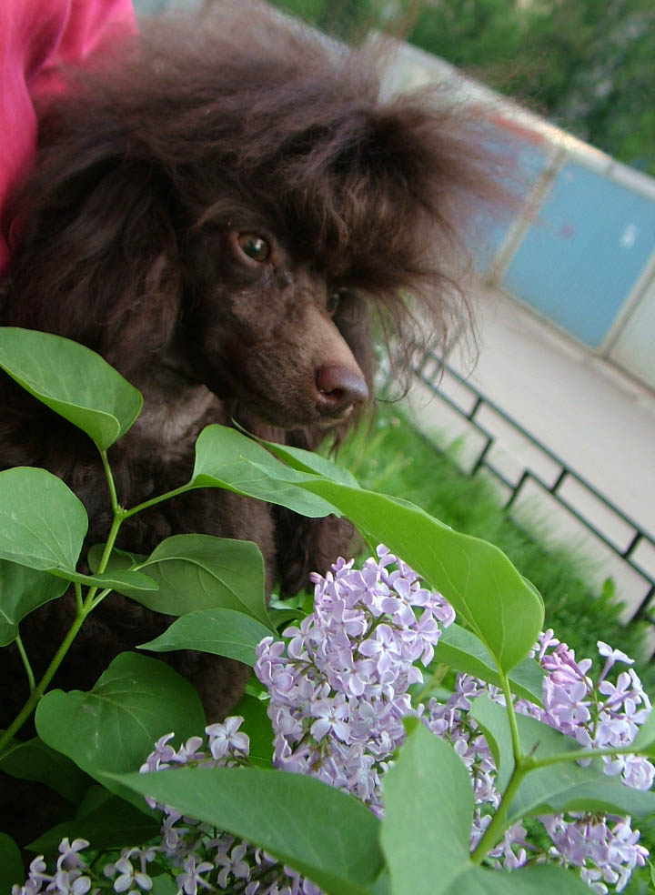 Кинопудель,шоколядный баксик - очень романтический мальчик,чуйственный.Фото замечательные получились! А вот моя фармазонка ,опять же - в цветах. |