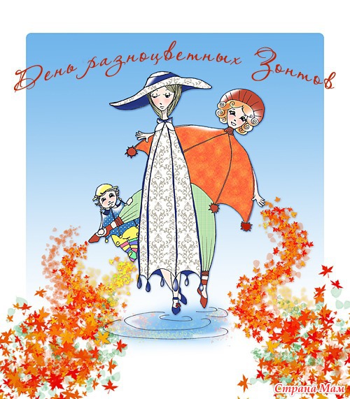 21 октября - День разноцветных зонтов. Клубничный зонтик озорной, зеленый цвета свежих трав, малиновый и ледяной, с рисунком сказочных приправ, оттенка солнца на заре, пестрее ярмарочных дней, как планетарий этот, тот - как в речке камушки на дне. Вот зонт, малюсенький, как гриб, и зонт большой, как дирижабль (его хотел купить Магритт). Я продаю их, мне не жаль зонты на волю отпускать - они по улицам пойдут, они расскажут всем вокруг в осенний хмурый будний день о том, что даже серый дождь не смыл улыбки у людей!