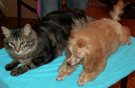 Кот у мамы очень скучает ,плохо ест и плачет.Кнута не хватает. елисей добавил(а) [date]1193298045[/date]: Сейчас они одного размера,только Глаша выше кота,31 см в холке-карлик. _______________________________________