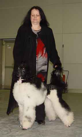 Ох девушки! Нас мало кто увидел на Евразии. Мы там оказались случайно и очень быстро свалили домой! А дело было так! ... Значит сижу я на работе в пятницу, вдруг звонит мне Алла (мама Радуси, есть такая девочка у нас на форуме), слушай Алка моя (дочку тоже Аллой зовут), записалась на конкурс хендлеров, а модели нет, давай твою Гвен. Я говорю - Да ноу проблем, тока она у меня балованная и заросла как медведь, да сейчас у нас смена шерсти и свалялась в добавок. Она мне - Ничего ночью помоешь, отфенишь, че надо срежешь! А сейчас Алла к тебе приедет, Сашка (сын) впустит и она с ней побегает! Ну приехали, побегали с часик, извазюкала она их, они на радостях приехали при всем параде в белых куртках! Приехала вечером с работы 22.00 и начался марафон, во первых надо было и себя в порядок привести -достала из комода пальто (купленное когда-то при хорошей жизни на распродаже коллекции Вячеслава Зайцева), новую шляпу с а ля цветком, намочила голову сунула ножницы в руки сыну и говорю - Стриги! Попытайся изобразить на мне каре. Он - С ума сошла! Я не умею! За последствия не отвечаю! Я - Фиг с ними, с последствиями! Стриги! В обчем пилит он меня и ржет, ну напилил чего то там, я попыталась все это слегка сравнять, покрасилась, ну для первого раза сойдет! Занялась Гвен. Мама дорогая, чего то я пропустила и Америка наела ей на загривке такие колтуны!!! ... Короче всю ночь разбирала колтуны, мыла и фенила ее! ... Постригла я ее уже утром перед выходом по Роминой схеме (Памятник ему надо поставить за схему стрижки "Скандинавский лев"!) за 1 час!!! ... правда не идеально, но для конкурса хендлера сойдет. Так теперь надо доехать конкурс в 12.00, а на часах 11.00. И как назло у всех у кого машина, какой-то катаклизм или в ремонте, или собирается туда, дочка сказала, что заберет нас с Гвен от туда, нуа туда сами. Попыталась заказать такси, мне сказали смогут только через час, я говорю - Вы что, мне вчера уже там надо было быть, а Вы говорите через час! Короче пошла частника ловить! Наконец один молодой человек не смог отказать даме в шляпе и согласился ее и стандартоного пуделя довезти до Крокуса! Времени уже нет, Алла мне звонит - Ты где? Конкурс уже начинается! Я - Стойте около ринга с ринговкой, щас прилетим на вертолете! Прилетели,выгрузил он нас! ... Погода, сами знаете!... Грязь, дождь, а у нас лапы белые, да и топ мы вязали уже в машине! ... В общем держу я ее на руках, а это 20 с лишним кг! .... А до входа ......! Кричу - Помогите кто-нить донести до входа! ???... Откликнулись ... Правильно! ... 2 девушки! ... Картина ... Прут 3 особы стандартного пуделя, к верху лапами, пудель довольный слов нет! Язык высунула, уши повесила - блаженствует! Мы - 2 девушки молоденькие и я - этакая матрона в черном пальто до пят, с бантом впереди как у кота Леопольда и в шляпе с широкими полями и цветком! ... Ну Вы понимаете, да!... Представили! ... Но так ведь ветер был! ... Короче слетает с меня шляпа (первый раз надела), падает в лужу и плывет! ... Немая сцена! И никто даже не подумает ее поднять! ... Я - Ну дайте мне ее кто-нибудь в зубы, не могу же я бросить собаку в лужу! ... Дали! ... Думаете кто? ... Правильно, опять девушка!... Дошли наконец! Сказала спасибо и мухой пролетела мимо пуделистов, они только успели рот открыть до ринга хендлеров! В ринг уже вызывают, успели только ринговку надеть и в ринг! ... Ну что сказать, учитывая все обстоятельства, то что вылетели со второго тура (я ду