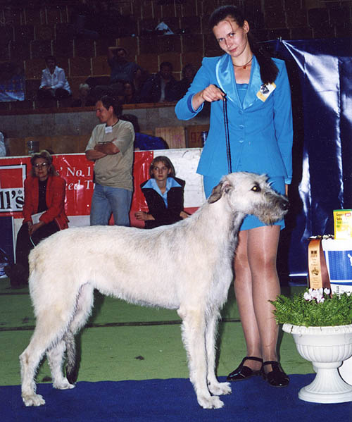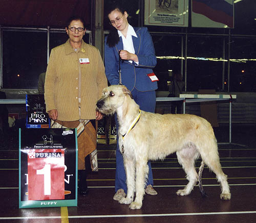 Powerscort’s California Dream «Дима», который был и остается для меня идеалом ирландского волкодава. Он был точно такой, как я видела на Американской выставке, по кассете с которой училась видеть и выставлять эту породу. Димка выиграл здесь все, о чем можно мечтать: в 15 месяцев ВОВ «Евразии» и 3 место в группе, затем были победы на Международных выставках, на монопородных, в группах. За всю свою карьеру он лишь однажды уступил в сравнении на лучшего кобеля и трижды его обходили суки (2 раза – его будущая жена, что поражением не считается;) ). Все! Остальные выставки он выигрывал вне зависимости от экспертизы и наличия конкурентов. Собака-мечта, шоу-боец и отличный производитель. На фото:Powerscort’s California Dream - BIG, ему полтора года |