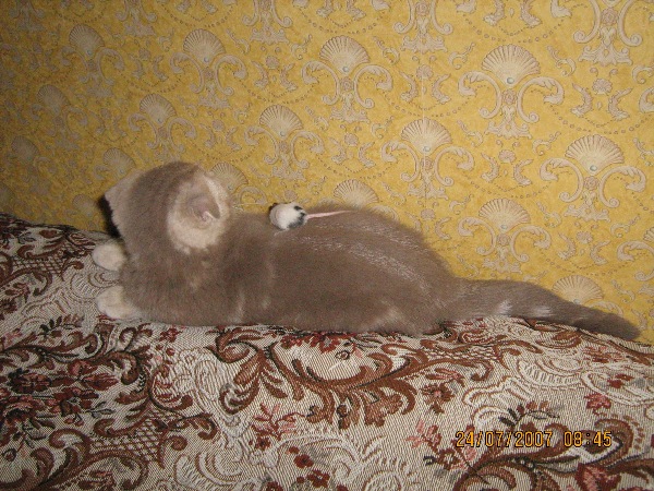 Мы мрамор, но полоски и все такое, у нас такие же неопределенные как и сам окрас. Она все равно странно лиловая, однотонно лиловые намного темнее, поэтому мы и не находили цвета на который она похожа, к тому же от освещения мех меняется, но носик потемнел и это все решило.