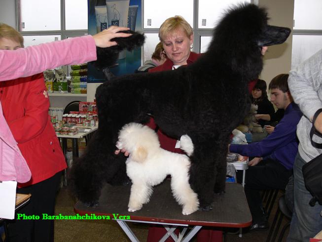 Поздравляю всех победителей! Вы тем более молодцы, что услувия были экстремальными. Слово "Краснобогатырская" вызывает у меня неприятные воспоминания... Елена Старчак, мне очень понравилась атмосфера на выставке Лидер-Престиж, и пудели, да, были хороши! Очень понравилась организация! Все лучшие бэби, щенки и юниоры получили подарки от фирм Нутро и Хэппи Дог, расписание практически соблюдалось (не более 15 минут опоздания), за что спасибо эксперту, Яне Гавриловой. Покрытие было отличным, а помещение достаточно светлым. Я повешу тут свою версию нашей "рекламной" фотографии: ![]() _______________________________________