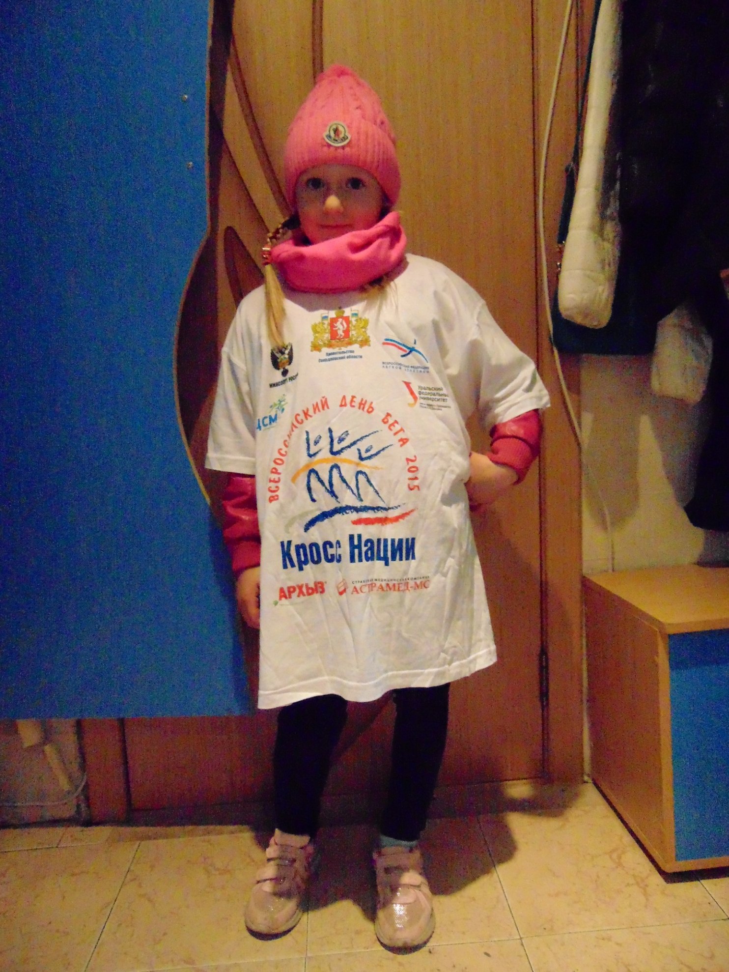 В прошлые выходные дочь случайно попала на общероссийские соревнования (со старшей сестрой пошли на ее занятия (Дашины) в спортивной школе и преподаватель записал на кросс наций. Сказал очень перспективная девочка... И она заняла 4 место среди детей из детских садов города. Вручили футболку. Вот! не могу не показать. Горжусь!