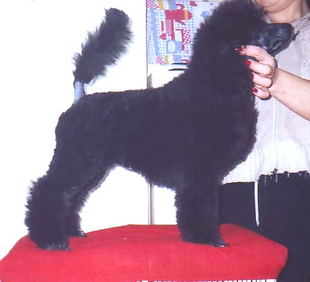 Предполагаю, что вы недостаточно простригли (подровняли) шерсть между передних ног и на нижней части груди. Не выведена линия к паху. Из-за этого создается впечатление, что у щенка коротковаты передние ноги или слишком глубокая грудь (черный и не видно локтя!) После того как высветлила одну из ваших фот, локоть стал угадываться. Я поставила красные отметки на "реперных точках" - верхушка лопатки - плечелопаточное соединение - локоть. Угол классический получился! Длина шеи тоже хорошая. Про постав сказать трудно потому, что ваша рука поддерживает... Вообще, по фото, щенок производит очень хорошее впечатление. Но это фото - сами понимаете. Да еще ведь и вырастить правильно надо. Это в какие руки еще попадет... Возвращаюсь к теме ДЛИНА ШЕИ. Все-таки мы ушли от обсуждения в углы плечелопаточного соединения. А Таня Либкинд спрашивала совсем о другом:"Какую шею можно назвать короткой, а какую длинной?". Я тогда же добавила в обсуждение еще параметры - "относительно других промеров". Не будем брать шею отдельно от собаки. Кто-то раньше тут ведь сказал:"А что породность пуделя определяется длиной шеи?". Вот сколько вопросов. Интересных. А в стандарте FCI даже все соотношения даны!!! Посмотрите, там дроби всякие понаписаны, что чему равно... Это наш с вами руководящий документ, товарисчы!!! _______________________________________