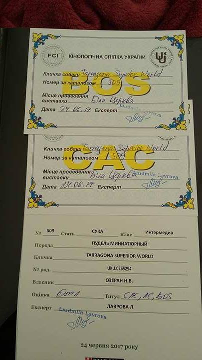 У нас тут Терюха Таррагона СВ с владельцами и без меня) съездили в Белую Церковь и получили очередной взрослый САС, ЛС, BOS а также выиграли первое место в конкурсе Ю.Хендлеров с Ксюшей - УРА! Поздравляю моих красунечек!!!!!!!! ![]() ![]() ![]()