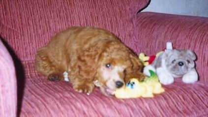 Меня зовут Наташа. Мне 22 года. Живу я в г.Гомеле, Беларусь. Первая собака, породы пудель карликовый абрикосового окраса, у меня появился в 10 лет. Я очень хотела собаку и родители решили взять песика размером поменьше. Так определились с породой пудель карликовый. В клубе узнали, что сейчас есть щенки абрикосового карликового пуделя. Так определились с окрасом. Щенка я уже выбрала сама. Он был самый шустрый. Мальчика звали Габриэль Флафи Меркури Чарм. Инбридинг 3 х 3 на Эдельвейса. На фото ему 10 лет ровно (19 июля 2004 г.) _______________________________________