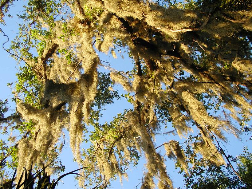 Поднимите взгляд наверх.... Таким мхом заростают деревья, провода, кусты. Корней нет. Он переносится ветром.