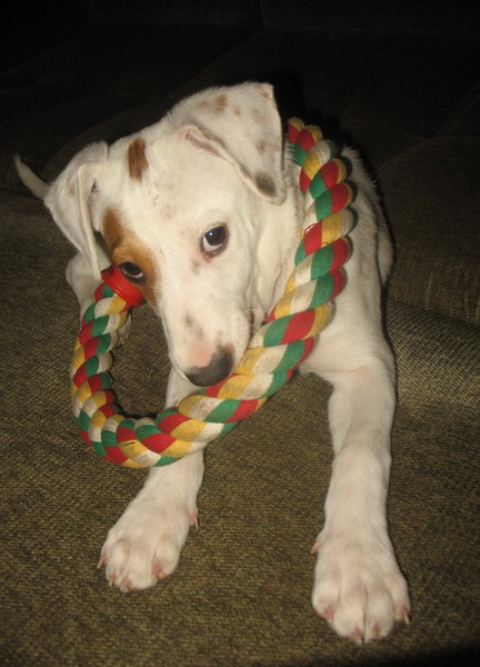 Сука замечательная, по словам заводчицы вырастет сантиметров на 40. Гладкошерстная, белая с пятнами. Пятна на морде делают ее удивительно похожей на гигантского джек-рассела. И вообще, собака явно не без "помощи" терьеров сделана. Юля говорит, что Бланка (так назвали девочку) - идеальна для спорта - аджилити, фризби, что угодно. Скоростная, очень контактная, с большим желанием работать. Вы не знаете, может кто ищет собаку для работы, кому важен характер и психика, а не родословная? Есть возможность доставить Блану в Москву. Фото на днях добуду и покажу. |