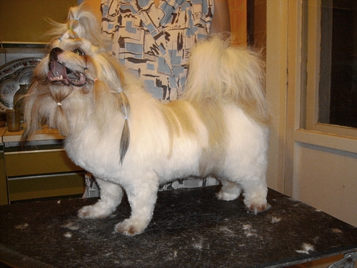 И стриженый. На голове попросили оставить шерсть длинную.Собрала ее в резинки как могла... Она вся какая то поломаная, разной длины.