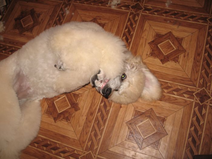 И стоит сама как красиво!!!! Отлично что решилась состричь "щенячку", ей этот прикид очень идет. Супер!!! А лапы они все любят свои погрызть и именно когда лежат на спине :). _______________________________________