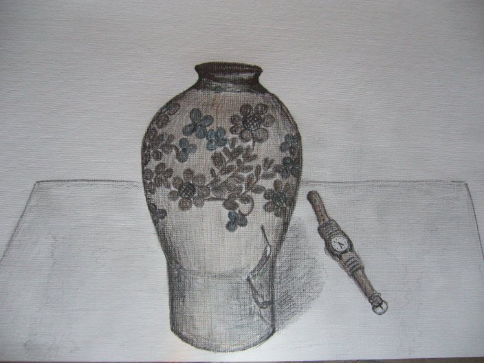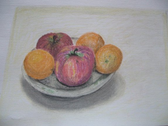попрошу не расслабляться на лаврах... ошибка взгляда - ты очень много потратила усилий, чтобы изобразить центральные предметы, и таки изобразила их! но какая пустота вокруг! она тем пустее, чем круче прорисованы центральные предметы... в следующий раз постарайся одинаковое внимание уделить всем элементам своей композиции, чтобы прорисованным фруктам не было так сиротливо, ладно? а розочку - тебе не хочется цветными карандашами порисовать?
