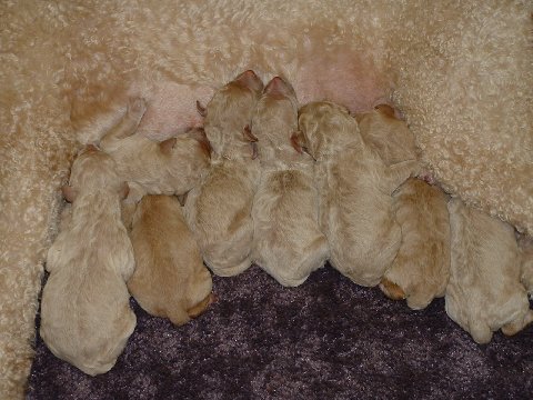 Retniw's Make A Wish and Farleys D Shiloh became the proud parents of 8 beautiful apricot puppies this morning. They have 3 boys and 5 girls.