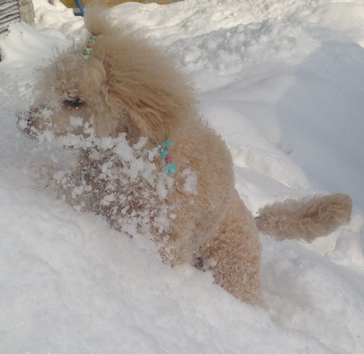 Патти мы с детства приучили к тёплой одежде и обуве (нам всё казалось,что без одёжек собачка наша замерзнет) в итоге это привело к тому,что Патти мерзлячка жуткая и зимой без одёжек гулять отказывается. А младшая наша пуделишка Зара,всю прошлую зиму с огромным удовольствием носилась по сугробам.Как Зара поведёт себя будущей зимой-не знаю,а прошлой зимой было вот так: