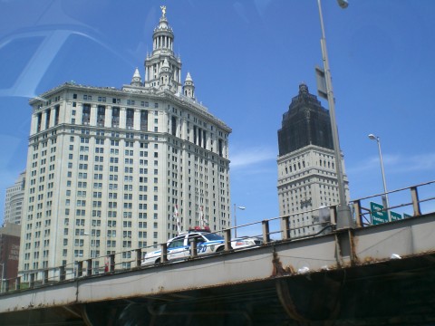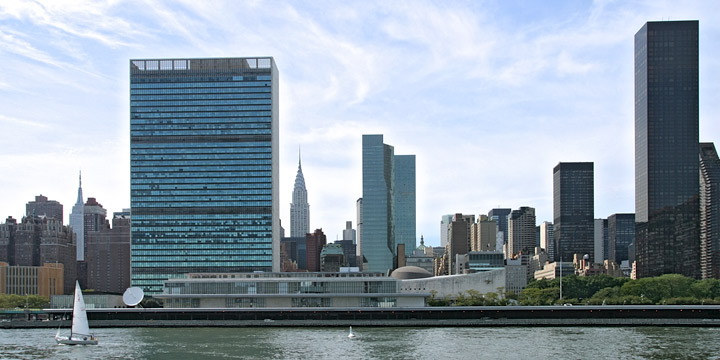 И еще один кадр. Здесь на переднем плане здания Генеральной Ассамблеи и Секретариата ООН. Голубое здание ровно посреди кадра - отделы и офисы ООН, ПРООН и других огранизаций системы Объединенных Наций. Здание со шпилем между двумя голубыми, Crysler Building, кажется выше другого шпиля, Empire State Building, но это оптический обман. Черная башня справа - Trump building, самый высокий в Америке жилой дом.