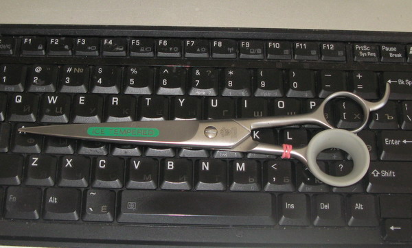 A это Dovo, купленные в грумстиле. Я их покупала в самом начале, до Роминых курсов. Не очень еще сооображая, как именно должны удобные ножницы в руку ложиться. Мы тогда всей группой с такими ножницами пришли:) Честно говоря, немного ими разочарована - они широковаты-тяжеловаты для меня. Ну и большой палец проваливается даже сквозь мега-резинку:) приделываю еще мега-устройство из скотча - ноу-хау Фомина:)