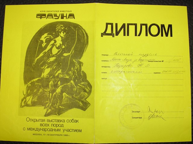А еще один раз такой же визг и хохот стоял когда во время одного из забегов афганов у меня сорвалась с пружинного карабина ЗЮКА, присоединилась к афганам, обогнала их на повороте и в одиночку понеслась за механическим зайцем. Пробежала метров 100 пока поняла, что бежит одна. А афганы в это время барахтались в ограждавшей дорожку сетке и жутко орали. Их туда загнала невольно ЗЮКА. Она ведь сделала резкий поворот, "сброс" налево, как все пудели, овчары и гончаки делают и "подрезала" их. А афганы так не могут, они плавно в поворот входят, вот и вошли, но только в сетку. Под рёв трибун ЗЮКА оставила зайца и вернулась к афганам чтобы посмотреть что случилось. Афганов удалось выпутать из сетки и отправить на старт. ЗЮКА никому (и мне) в руки не давалась и вместо этого тоже побежала на старт, где втиснулась между приготовившимися к старту афганами. С ними опять случилась истерика. На трибунах хохот повальный - представьте еще меня, бегающую медленнее чем ЗЮКА и еще пару-тройку крепких мужиков, пытающихся ее поймать. Возбужденная ЗЮКА не понимает почему ее хотят лишить такого удовольствия... Наконец ее умудрился схватить в охапку один из владельцев афганов, стоявший во второй стартовой группе. Этот забег мы сорвали. Еще сорвали шквал аплодисментов. Досматривать бега я не стала. Уходя всё оглядывалась - а вдруг поймают и надают мне по шее за свой позор. Ага, добавлю рост ЗЮКИ - 59 см, косая длина 61см, объем груди и крупа впечатляющий. Не слишком изящная была... Вот она на первой международной выставке, где принимали участие наши пудели - ИНТЕРКАНИС Брно-1989. Первый САС, полученный пуделем нашего разведения. _______________________________________
