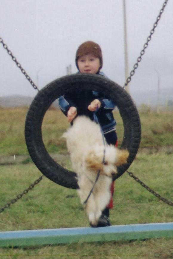 Тори, специально для вас полезла искать у себя фото с аджилити, раз с этих соревнований нет. Этому мальчику года 4-5. Он канеш не в проф аджилити был, а в преодолении препятствий (раньше, когда аджилити у нас только зарождалось, была и такая номинация - для начинающих).