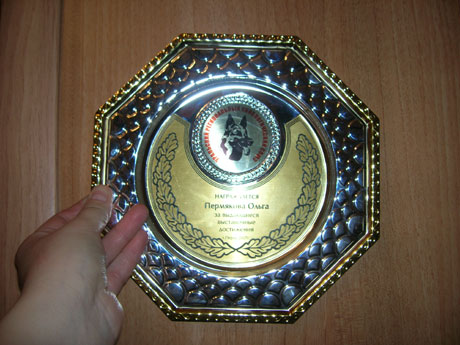 а еще на выставке было награждение собак клуба по результатам года. За двух Интеров мы получили по кубку. А лично мне, за особый "фанатизм" выдали вот такую штучку!
