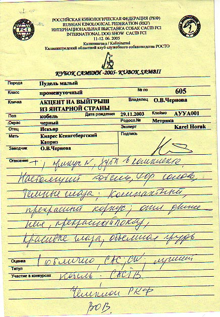 Письма писала, не отрицаю. А что, нельзя писать писем и пытаться выяснить где какие собаки родственных кровей есть? По фото я стараюсь собак не оценивать, как и по титулам - я слишком хорошо знаю чего стоят титулы. особенно на периферии. У меня старшая сука все имеет что можно иметь по российским меркам, и ЮЧР, и ЧР и ЧК БОБом на прошлой националке, и две группы выиграла. я очень ее люблю, но звездой она от своей титулованности простите не становится. У нее есть неоспоримые достоинства, в том числе как у производительницы, но как шоу-собаке ей мешают ее недостатки. Я здраво отношусь к титулам. Шерсть у вашего кобеля шикарная, я это могу повторить хоть под присягой. И голова красивая. Это все что я на нем видела, руками как вы помните трогать не стала - чтобы не мять перед рингом, да и руки у меня течной сукой пахли, смущать мальчика я не стала о чем прямо вам и сказала. Вы же сами так любите писать на этом форуме что вашей собаке не хватает темперамента в движении и углов. Я с вами совершенно согласна в этой оценке. О чем собственно и написала. Так где здесь черный пиар, стесняюсь я спросить? Если вы сами неоднократно прилюдно писали об этом? Я повторяю слова и оценки заводчика и владельца, которые к тому же полностью совпадают с мнеием людей за рингом... Так что может я и горячусь на предмет компенсации... Пожалуй, все собранное вышлю г-же Барабанщиковой, как самой обиженной моею статьей. Да что я право слово. Вот, чтобы не быть голословной: Цитата: