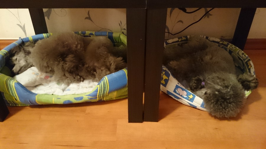 Сестре тяжело было рано по утрам гулять с ними, решила, что пока собаку не хочет))) Уж больно ответственное это дело))) Без разбора колтунов в гриве Форти правда не обошлось(( По приезду сразу устроила им банно подстригательный день.