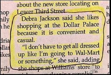 Перевод про камень - пять баллов ![]() Tamara добавил(а) [date]1209949779[/date]: фраза из из местной газетёнки: "Дебра Джаксон говорит что ей нравится шопиться в Доллар Паласе (самый какой ни есть дешёвый магазин, где всё стоит в районе бакса) потому что ето удобно и казуально. "Мне не нужно выряжаться как будто я отправляюсь в WalMart или что-то в етом роде" ето смешно потому что в WalMart действительно не стоит наряжаться и можно представить в чём она тогда ходит если ей приходится наряжаться в WalMart, и можно догадываться что в её понимании означает "выряжаться". А грустно потому что в таких городишках кроме как в WalMart наряжаться действительно некуда... Tamara добавил(а) [date]1209950342[/date]: подпись под фотографией в Роаноки Таймс (серьёзная беременная тётка с сигареткой) гласит: "Мелисса Вильямсон, 35, жительница Буллитт Авеню, переживает по поводу еффекта шума отбойных молотков на её нерождённого ребёнка"