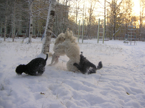 У меня все руки не доходят их сфотать нормально. Сейчас работы - просто невпроворот, щенов только ночью вижу. С ними все больше няня. Обязательно сфотаю и вывешу. Ее уже с нетерпением ждут в г.Сумы. Вот сейчас сделаем вторую прививку и через 10 дней она отправиться на ПМЖ. Но сейчас я просто ухохатываюсь. Два ее брата - малые. Один - весьма приличного размера. Один брат - карлик, не очень мелкий. А она между ними ну просто как белый таракан бегает. Но она мне очень нравится - корпусная, коротенькая, ногастенькая и с боевым характером! Тип - Митькин, хоть никто на него не инбридировал. Типичный Митин детёныш с дурашливым Мозаикиным выражением морды почему=то..... Интересный у меня инбридинг получился.... А сестру Орбита Орнеллу ты никогда не видела? Она малая. Я ее фоток нигде не видела, у меня только остались ее, маленькой в 5 месяцев, перед самой передачей Арини.... От нее сын выставлялся в Югославии, привозили хендлеры Орбита. Такой КОНЬ, мама не горюй, где-то под 44! Урсик у него тогда выиграл. Сама Орнелла была в типе Урса, но чуток пошире корпусом и с ТАКИМ ЛИЦОМ, что ой! |
