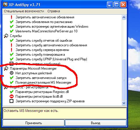 Ad-aware от Lavasoft: http://www.lavasoftusa.com/russian/support/download/ Отзывы просто отличные, сам пользуюсь постоянно, язык- можно русский, или англ. Программа бесплатна (в стандартном варианте). Вычистит всю дрянь с компа По поводу Мессинджера- я уже советовал выше прогу XP-AntiSpy v.3.71 Програмка небольшая, инсталяции не требует: http://www.listsoft.ru/programs/10481/ Скриншотик: snowbird добавил(а) [date]1057660301[/date]: Что же касается Popup Killers, то я перепробовал их целую кучу, сейчас остановился на PopUpCop, очень приличный киллер, много функций. Если кому требуется: http://www.popupcop.com/PopUpCop.exe Это- регистрация проги: name: Mister Stop serial: 1PTGM4P0U2KEADP Желаете- дам линк на русификатор! Удачи!!! _______________________________________