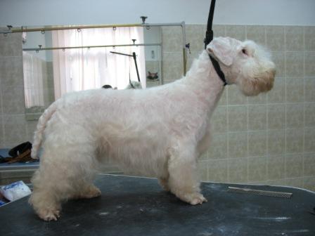 Ему два года, ни разу не был триммингован - шерсть на спине тонкая, мягкая и кудрявая. Я думаю, что его несколько раз стригли машинкой, хотя хозяйка говорит, что нет. Привели его с уже стриженной головой и задом - на мой взгляд и там и там состригли лишнего - я бы сделала по другому. Щипать пришлось пальцами и с мелом, так как от тримминговочного ножа шерсть просто рвалась (это при том, что я работаю очень тупыми ножами). Макс перенёс всё образцово показательно, хотя процедура для него была не из приятных. Силихема я делала впервые, это порода новая для меня - поэтому буду благодарна, если кто-нибудь из мастеров укажет на мои недочёты